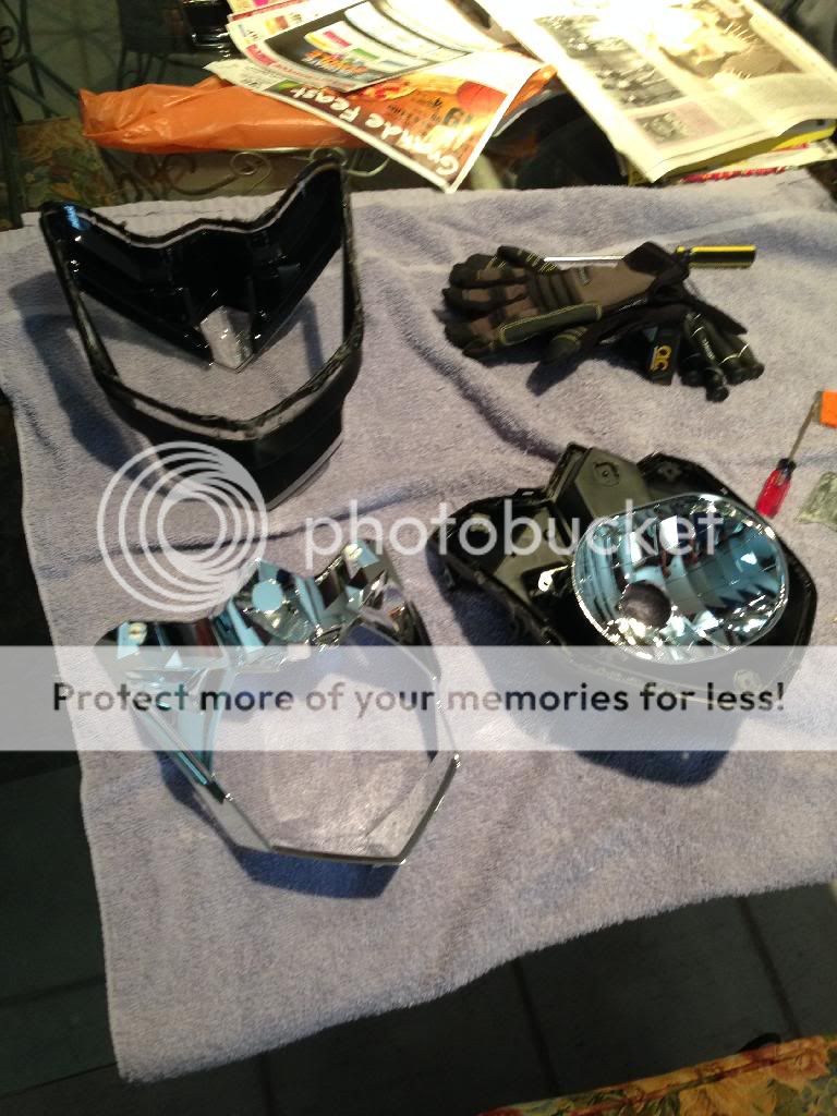 well I have finally taken the plunge! been wanting to do this for a while and I knew i didnt want to do a hid kit in the stock housing because it just doesnt do very good as far as a high and low beam and i need more light because i sometimes forget to switch out visors and end up getting stuck riding at night with a light smoke icon windscreen and the factory lighting SUCKS. i really wanted to do my truck but i figured i would start with my bike because i only have to mess with one headlight for my first try lol